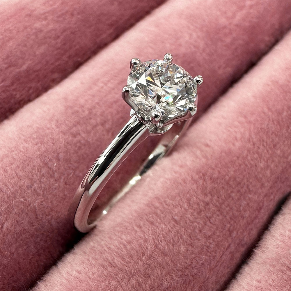 Anello solitario da fidanzamento con montatura tipo Tiffany in oro bianco 750 massiccio con diamante Lab-Grown certificato colore D da 1 Carato (1,00 ct) taglio tondo brillante Ideal incastonato a mano, ideale per la tua proposta di matrimonio.
