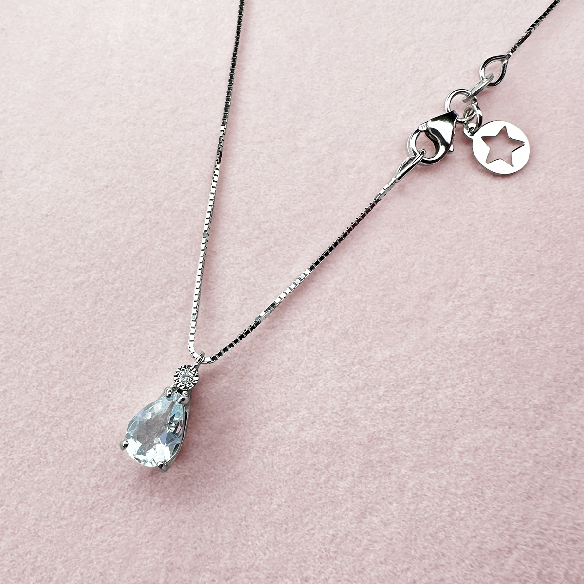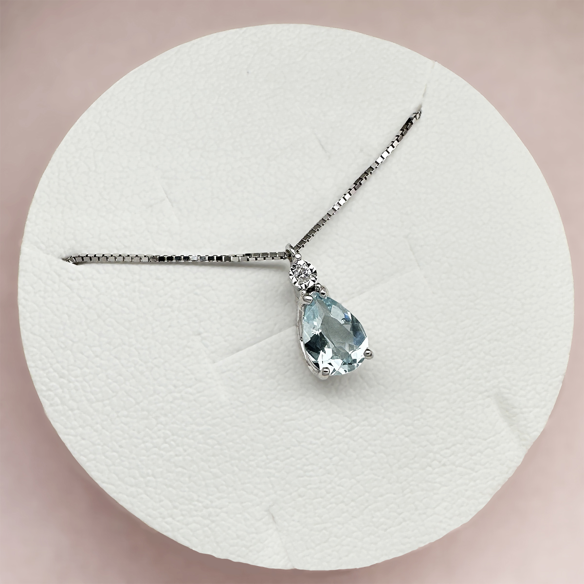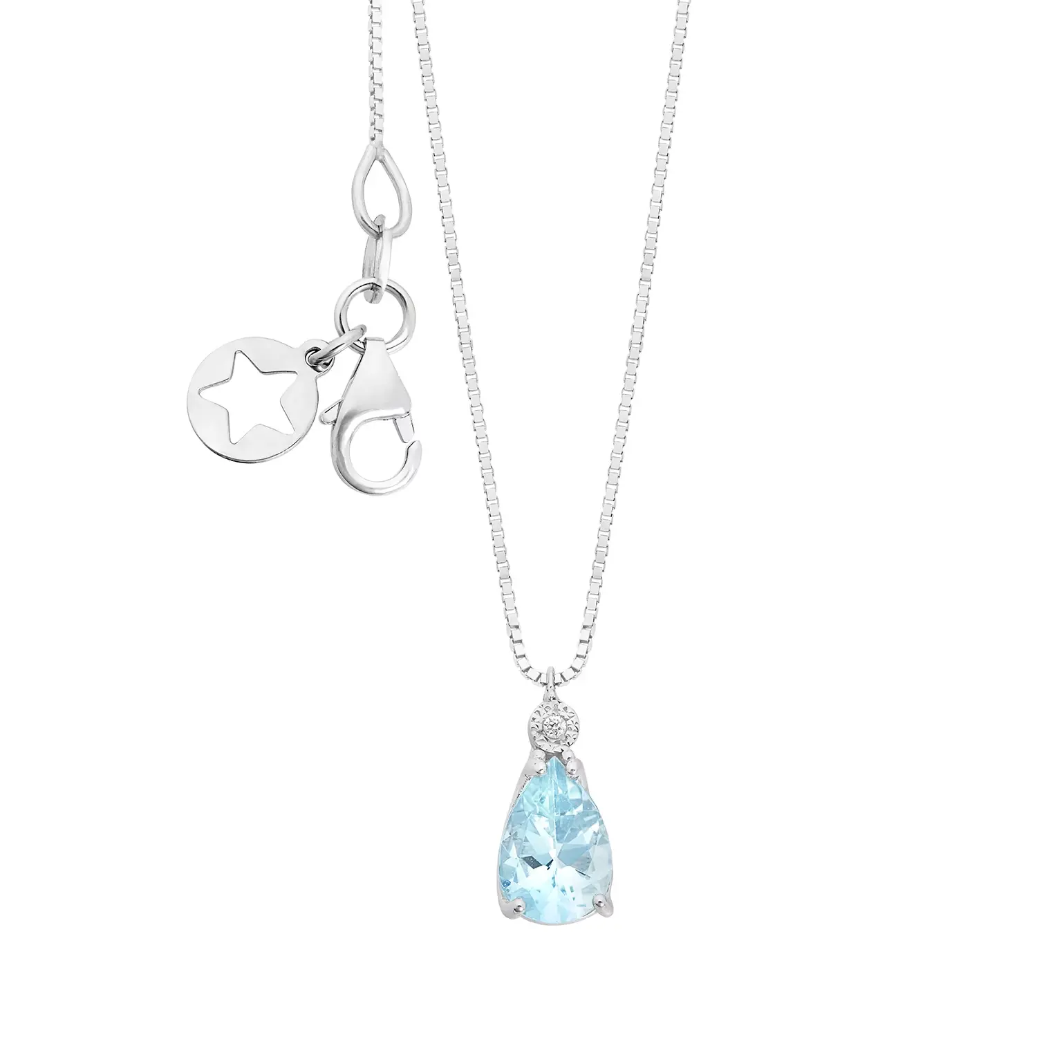 La selezione accurata delle pietre e il taglio a cuore dell’acquamarina sono studiati per catturare ogni riflesso, rendendo il viso luminoso in ogni occasione, dalla quotidianità in ufficio a una serata speciale. Questa collana con ciondolo Comete in Oro Bianco, Acquamarina Goccia e Diamante esalta la bellezza naturale in modo unico.