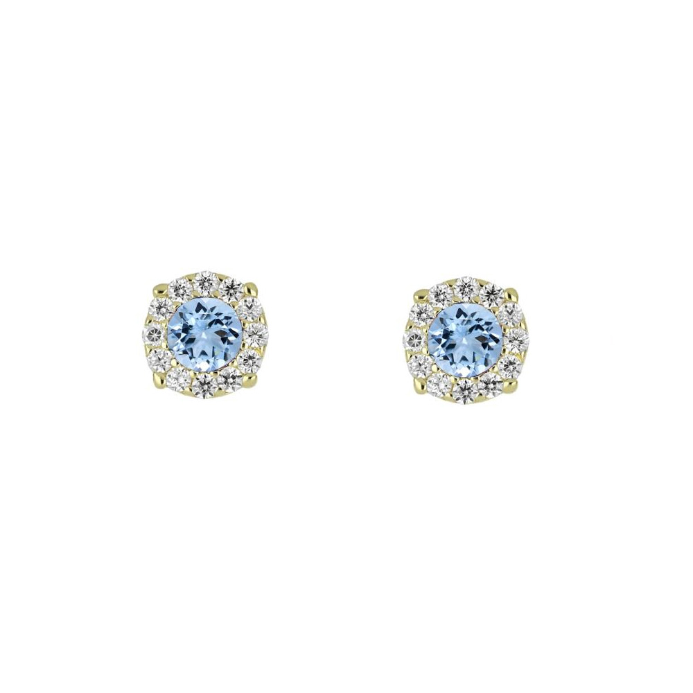 Orecchini donna a punto luce modello Halo in Oro Giallo titolo 375 (9 carati) con zircone Azzurro Acquamarina e contorno di zirconi bianchi Top quality taglio tondo brillante.
