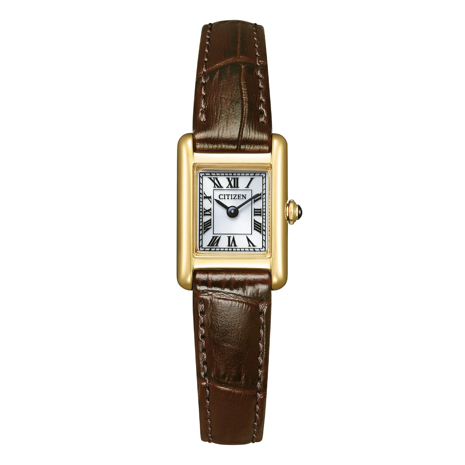 Orologio da donna Citizen Citizen Lady Rettangolare EG2797-13A con cassa in acciaio PVD oro giallo da 24,5×17,5 mm  , cinturino in pelle e quadrante bianco con indici romani alimentato da un movimento Eco Drive con 3 mesi di riserva di carica.