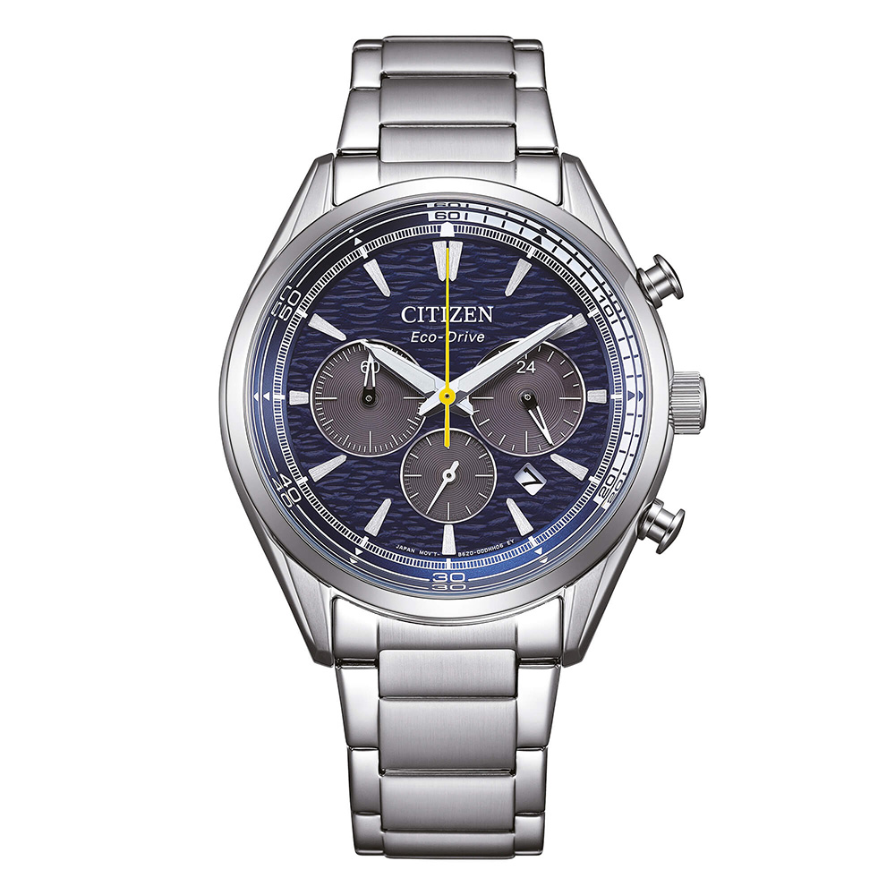 Orologio sportivo da uomo Citizen Eco-Drive Sport Crono, cronografo a ricarica solare in acciaio con quadrante blu texturizzato.