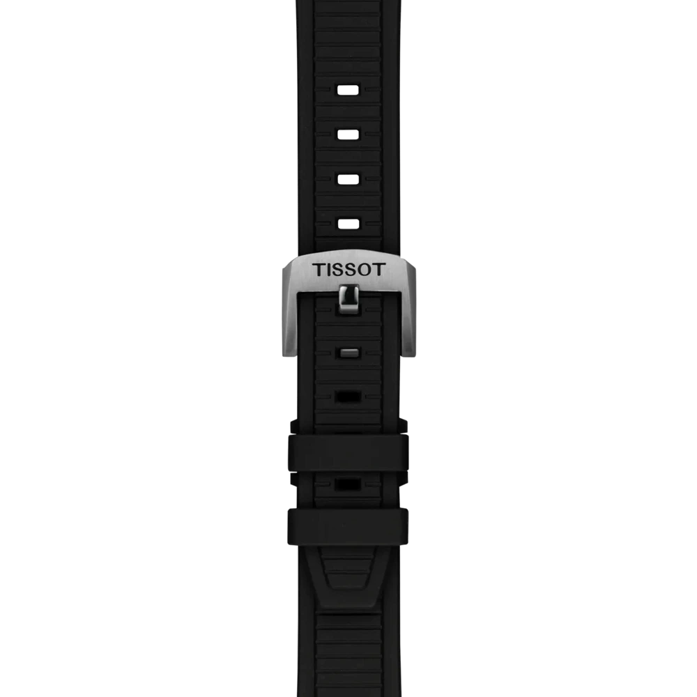 Orologio da uomo crono sportivo Tissot T-Race con cassa tonda da 38mm con quadrante nero, movimento al quarzo e cinturino in gomma silicone nero.