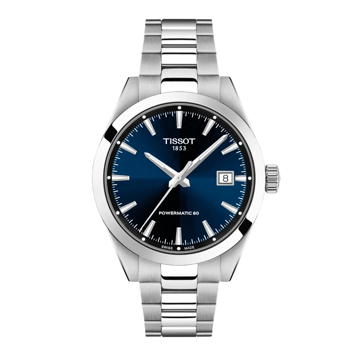 Orologio da uomo Tissot Gentleman 38mm con cassa e bracciale in acciaio e quadrante blu, movimento Automatico Powermatic 80 con 80 ore di riserva di carica.
