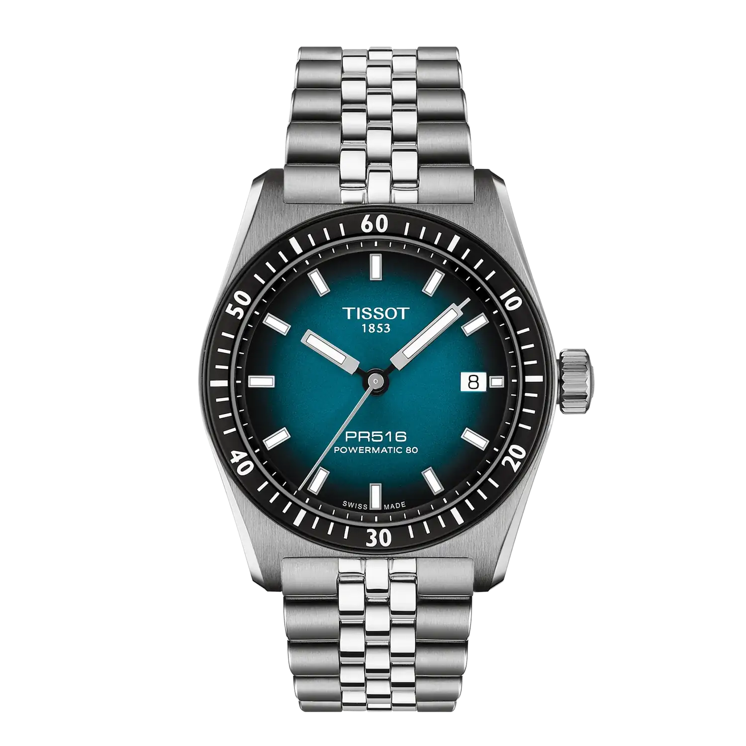 Orologio sportivo da uomo Tissot PR516 Automatico powermatic 80 con cassa e bracciale in acciaio e quadrante blu sfumato.